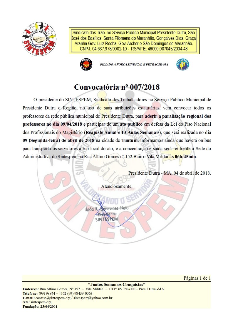 O SINTESPEM convoca toda sua base territorial para participar deste grande ato público em defesa da Lei do Piso (11.738/2008)