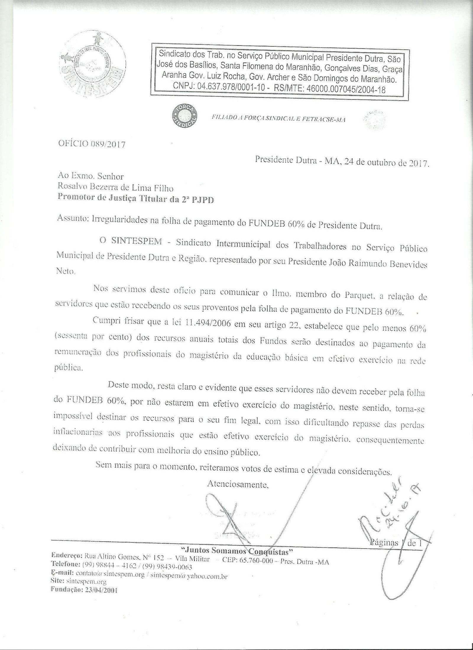 Na ocasião foi protocolado nas mãos do Dr. Rozalvo uma relação de pessoas que não estão em sala de aula e outras que não deviam estar recebendo salários pelo FUNDEB. Só nesta relação, os valores pagos mensalmente daria para dar quase três correções salariais aos professores. O promotor disse que irá instaurar procedimento imediatamente contra o município para que responda sobre as denúncias e frisou que agora tinha em mãos algo concreto que fundamentava o pleito do sindicato.